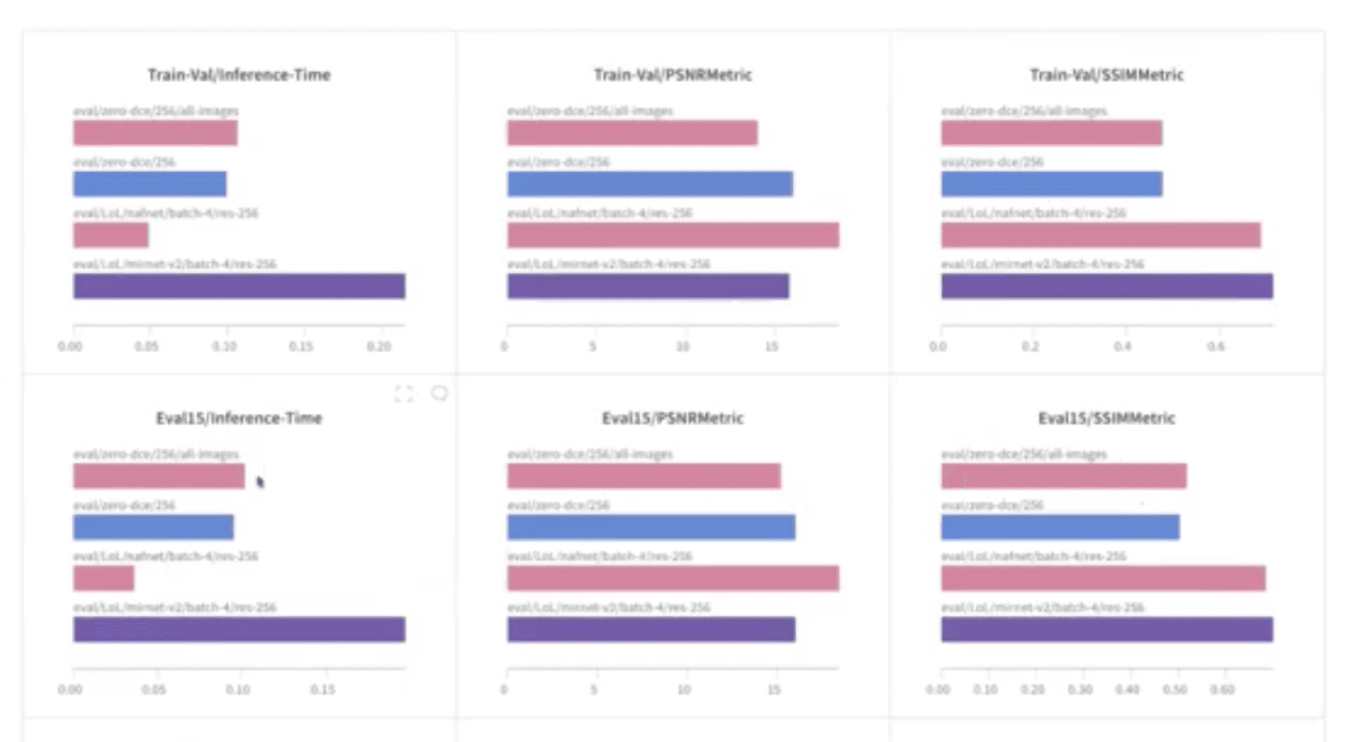 Learn more about Zero-DCE, including how to train it using restorers and wandb from ~31:33 - 37:02 in the video replay. For the code, check out this Colab notebook. Now that Soumik has shown us how to train low light enhancement models, he shows us how to evaluate them on the LoL dataset using the restorers.evaluation API, and how to log the results in a Weights & Biases dashboard. For the code, check out this Colab notebook. While upon first glance, it seems like NAFNet is the most performant model according to the number of trainable parameters, and especially compared to MIRNet-v2, Soumik next runs inference on the models and shows examples of poorly lit images so we can see how the models perform. (You can follow along with this part from ~40:09 - 44:35 in the video playback.) What do we see? NAFNet produces some great images, but it can also introduce weird artifacts in your image. This won’t work for a scenario where a low light enhancement model is used as a pre-processing step for object detection models. Soumik has already dismissed MIRNet-v2 because it was too slow and too large of a model. But Zero-DCE is looking really good.