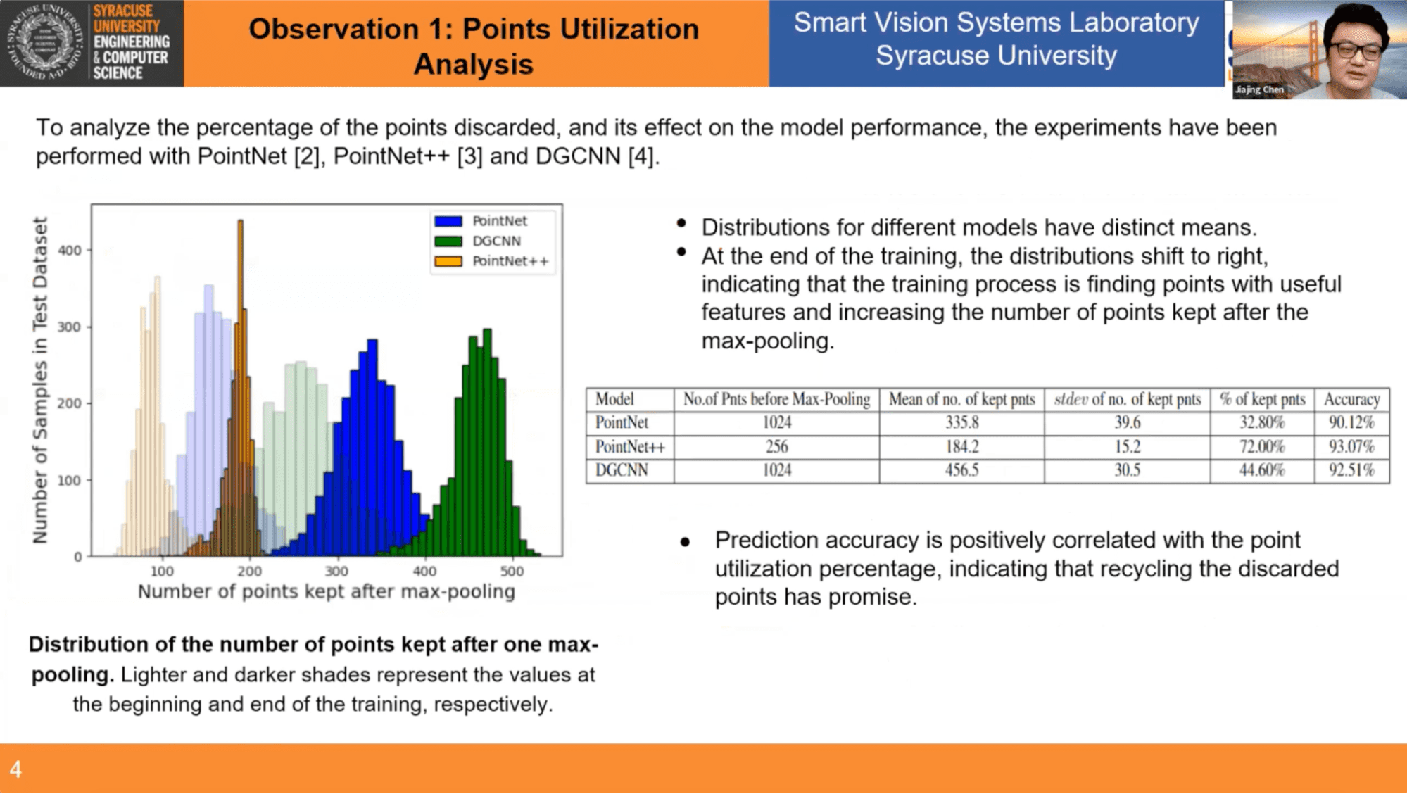 Jiajing, along with colleagues, set out on a research journey to see if they could find a way to recycle those discarded points to make the original network's performance better. And indeed, they did! The research (available here) has shown that recycling the still useful discarded points can improve the original network’s performance. In the rest of the talk, Jiajing explains the series of experiments that were conducted, the key observations they made along the way, and the new proposed method for a recycling max pooling module. In the first experiment, Jiajing and his colleagues set out to verify whether or not the number of utilized points has a correlation with the final accuracy. They selected three milestone networks for the experiments, PointNet, PointNet++, and DGCNN, and studied point utilization during prediction, both before training and after training. What they found was that at the end of the training the number of points kept after the max-pooling increased. Therefore the first key observation was: prediction accuracy is positively correlated with the point utilization percentage, indicating that recycling the discarded points has promise. (You can watch this part of the presentation from ~4:11 - 6:05 in the video playback.)