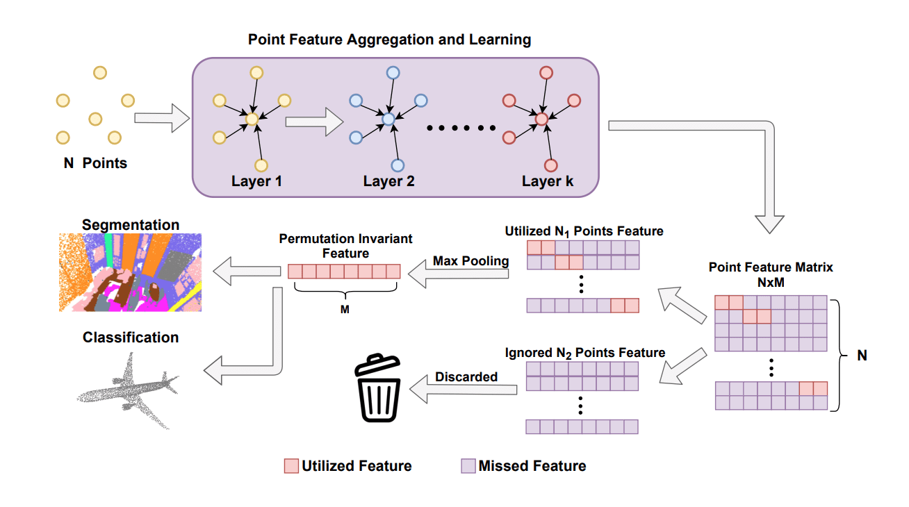Yet traditional max-pooling causes only a fraction of 3D points (red boxes) to contribute to the permutation invariant features and discards the rest (all purple rows)