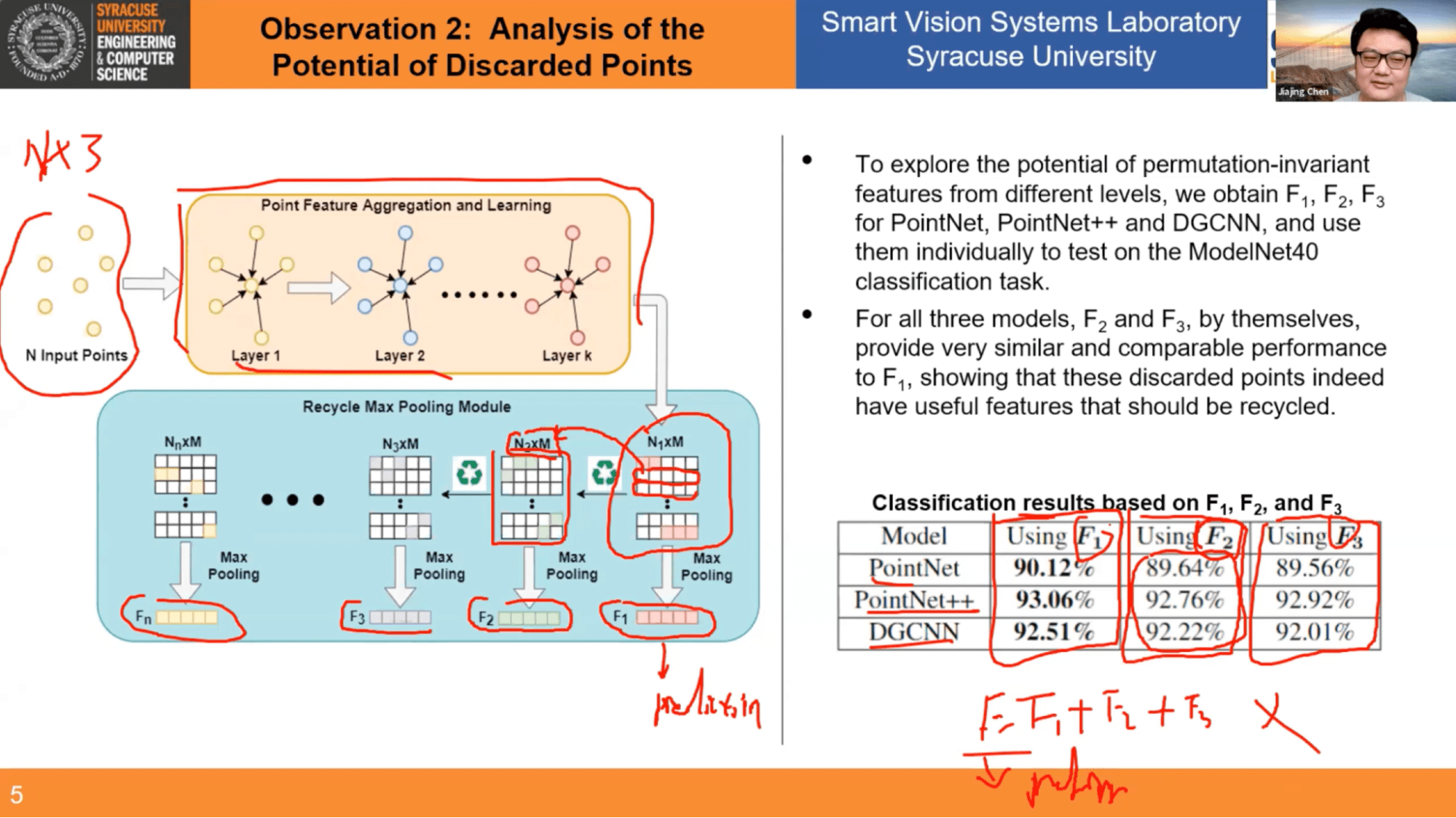 Moving onto the second observation, analysis of the potential of discarded points, Jiajing presents the information to us NFL-play-by-play style (which you can watch from ~6:05 - 8:49 in the video playback). The research team ultimately observes that applying recycling to max pooling (shown in the slide below as F2 and F3) does result in a drop in accuracy, but it’s not really that much, which means these discarded points indeed do have useful features that should be recycled.