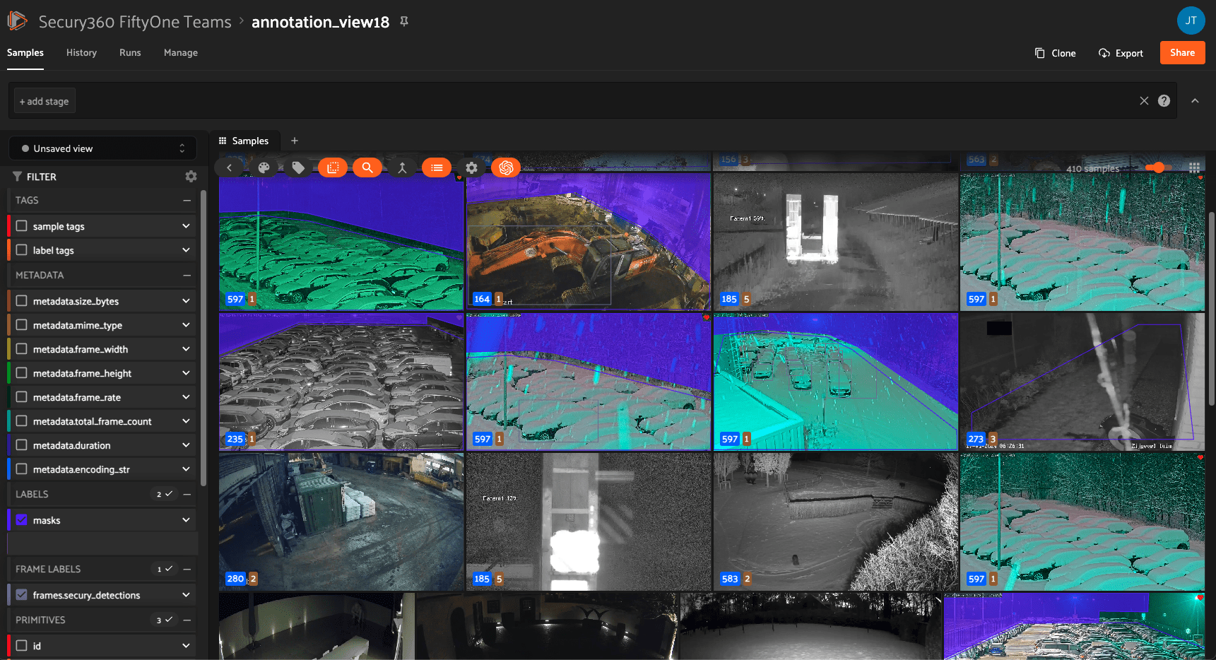Secury360 relies on FiftyOne Teams daily for data filtering, visualization, and evaluating model performance. FiftyOne Teams manages Secury360’s expanding dataset, which currently comprises one million videos, and facilitates rapid querying. This allows for swift identification of intriguing scenarios, including false positives like a tree branch obscuring a camera’s view, which are then used for model training. “We set up our data pipeline to use FiftyOne Teams as the backend so we can ingest our data from Azure and automate everything across the board. For example, with FiftyOne Teams we can now automatically create a data subset of new false detections using very detailed filtering, and then automatically send it off to our annotators. Then, after training our models on that new data, we can very easily compare results to previous and future training runs because all our data is managed by FiftyOne Teams.”