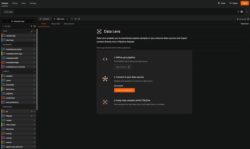 To solve these pressing issues that most teams face, we created Data Lens, the newest workflow within FiftyOne Enterprise, designed to simplify and accelerate your data discovery. At its core, Data Lens is a powerful data exploration and retrieval tool that helps you quickly explore and retrieve exactly the data you need from billions of available samples. You can easily query, preview, and import relevant samples directly into FiftyOne without manual bottlenecks or slow searches.