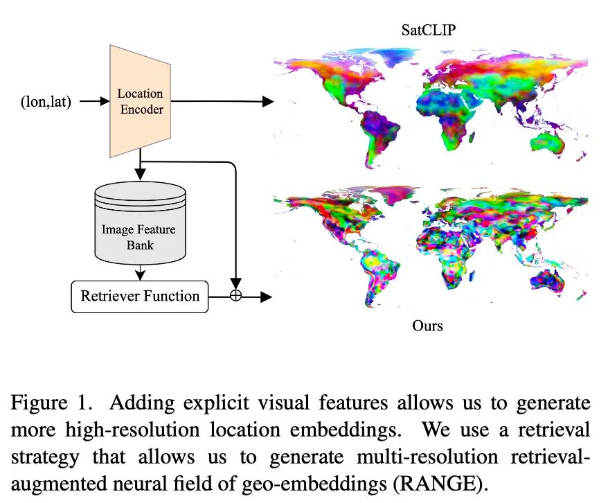 Modern geospatial AI relies on location-image alignment, but what if your model could predict what a place looks like — without seeing it? RANGE taps into the power of retrieval to approximate rich visual features and boost geolocation-based predictions.