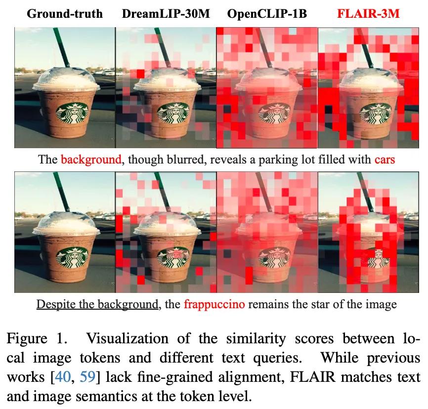 The visual example in Figure 1 shows FLAIR’s superiority in token-level grounding: while other models like DreamLIP-30M and OpenCLIP-1B struggle to highlight relevant details (e.g., “cars” in the background or “frappuccino” in the foreground), FLAIR correctly aligns image regions with their corresponding textual cues, even when context is blurred.