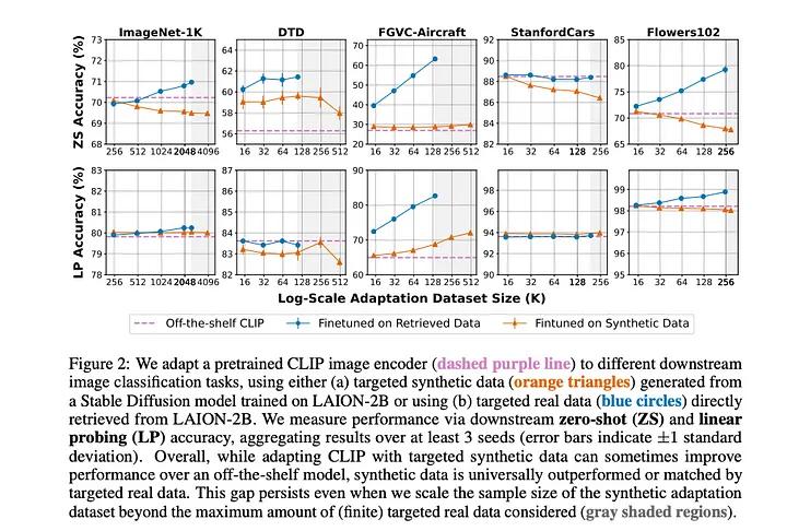 These findings highlight the limitations of using synthetic data generated by current text-to-image models for fine-tuning pre-trained vision models. The researchers conclude that further improvements in the quality and fidelity of synthetic image generation are needed to surpass the effectiveness of training directly on relevant real-world data.
