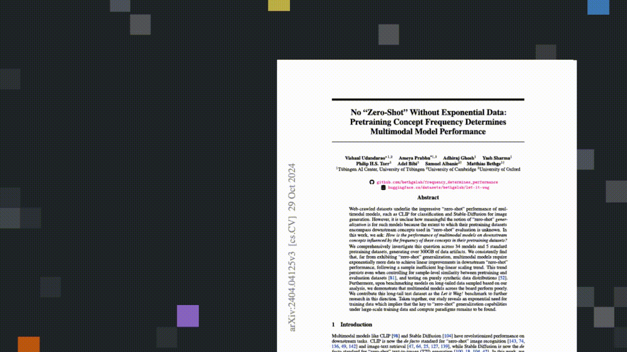 The term "zero-shot" has become widely used in deep learning, particularly with the rise of multimodal models like CLIP and Stable Diffusion. These models exhibit the remarkable ability to perform well on tasks involving concepts they haven't been explicitly trained on, leading to claims of "zero-shot" capabilities. However, recent research challenges this notion and suggests that what we perceive as zero-shot generalization might simply result from models recognizing concepts they've already encountered during pre-training. We sat down with Vishaal Udandarao, lead author of the paper No Zero-shot Without Exponential Data. Vishal and his co-authors investigate whether this zero-shot performance is truly due to generalization by examining the performance of 34 multimodal models on various tasks, including classification, retrieval, and image generation. The key discovery? The frequency of concepts in pre-training data strongly predicts zero-shot performance. It turns out that models may recognize rather than generalize these concepts based on their prevalence in training data. The linear relationship suggests that increased concept frequency exponentially boosts model performance. In other words, models tend to perform better on concepts that appear more frequently in the massive datasets they are trained on. This raises questions about the true meaning of zero-shot generalization.