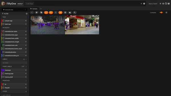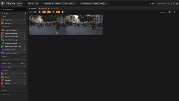 The tracker has generated detections and also stitched them into trajectories, typically by utilizing some combination of a motion and appearance/reID model. How can we gain insight into the quality of the tracking? One step is to evaluate false positive and false negative detections. This can be done using FiftyOne’s built-in evaluate_detections method, which supports video datasets and will compute evaluation statistics on frame-level detections. For multiple object tracking in video, false positive and false negative detections do not tell the whole story. Various metrics (TrackEval can be defined to assess different aspects of this problem. We’ll leave a deep dive into this type of evaluation for another time. Here, we focus on finding identity swaps in the tracking. One type of identity swap occurs when a predicted trajectory jumps from one individual to another. This can occur when two trajectories cross paths and occlude each other, for example. (We use the term “identity swap” informally; more careful definitions can be made, eg in this article). One of FiftyOne’s strengths when working with video is that it is easy to switch between data modalities. We can convert full videos to individual clips, for instance, or from videos to images. In this next analysis, we’ll convert our tracked video to individual frames and work with image samples. Since we only included people during tracking, we’ll filter our view to include only the person class from the ground_truth. Then, we’ll call to_frames which will convert our view to an image/frame-based dataset.