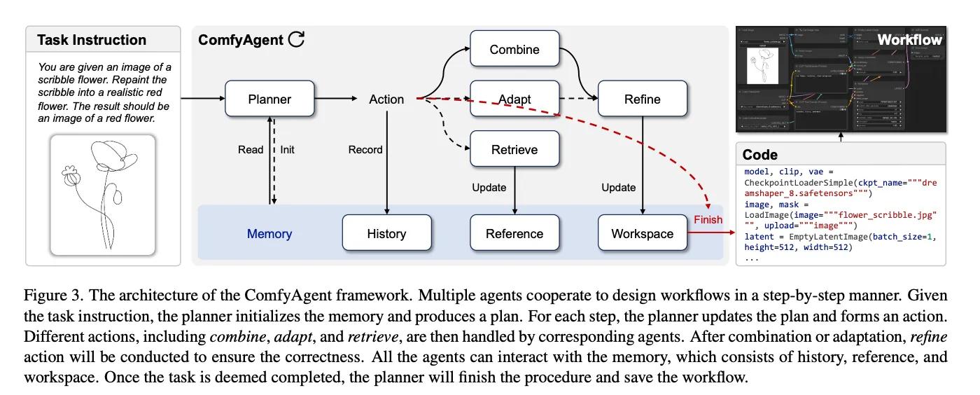 ComfyBench stands as the first-of-its-kind comprehensive benchmark specifically designed to evaluate agents’ capabilities in designing and executing collaborative AI systems within ComfyUI — an open-source platform where users construct workflows by connecting nodes (representing different models or tools) in directed acyclic graphs (DAGs). Complementing this benchmark is ComfyAgent, a novel framework built upon two core innovations: representing workflows with code rather than other representations, and employing a sophisticated multi-agent system with specialized roles (planning, retrieval, adaptation, refinement) that collaborate to overcome limitations like context constraints and hallucination.