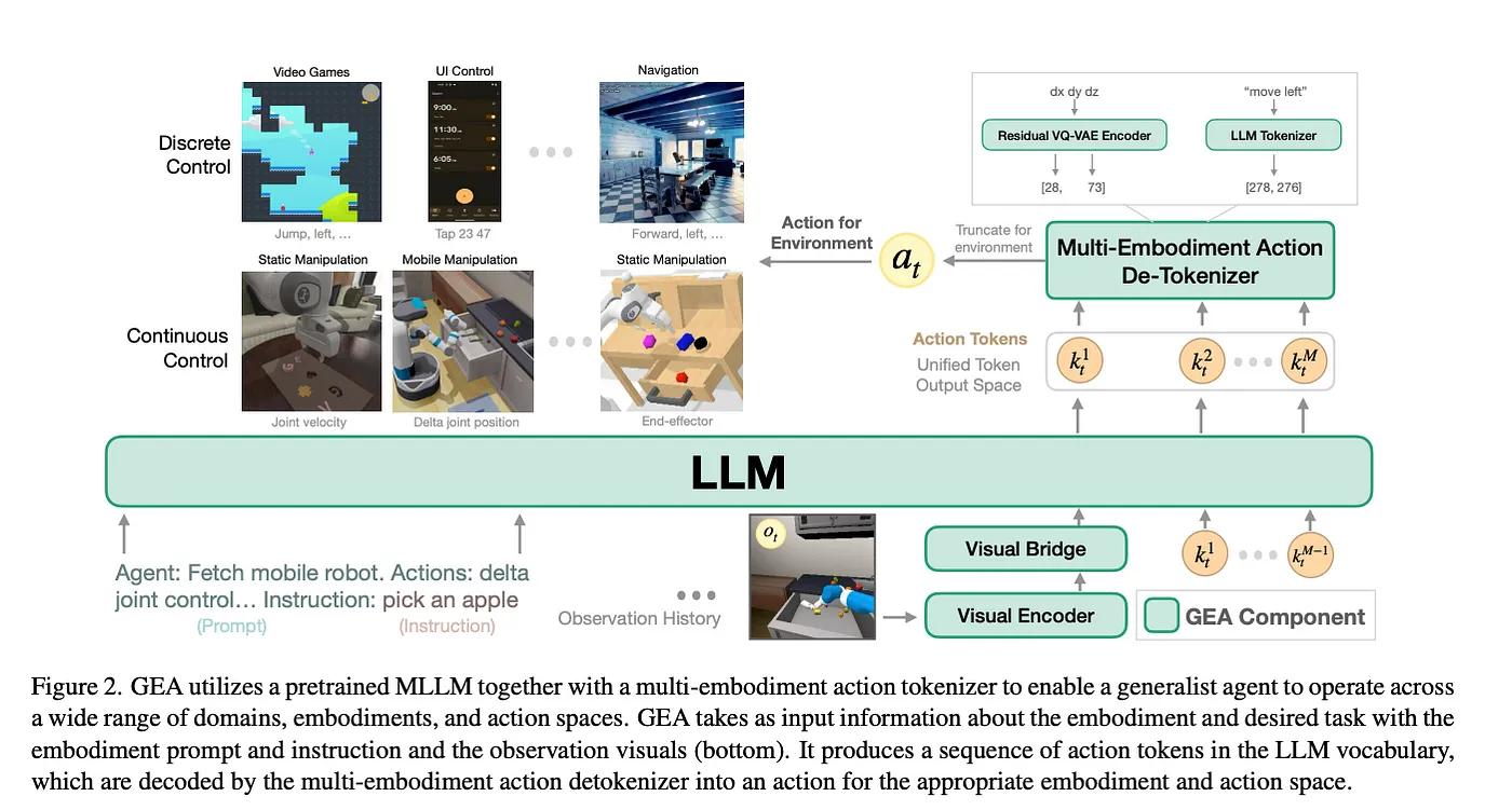 Unified Model Architecture: GEA adapts a pretrained MLLM to process environmental context and predict appropriate actions across various domains.