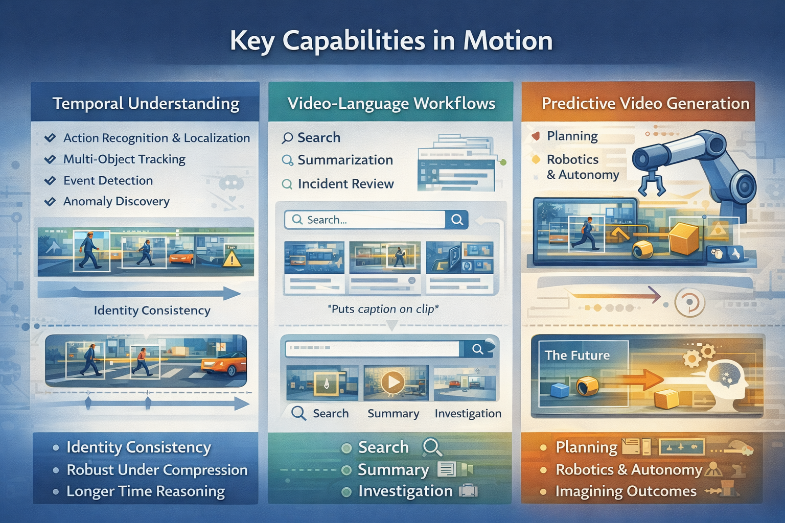 Video-language workflows are accelerating, too. The practical value is no longer “let’s put a caption on this clip.” It’s search, summarization, and “what happened?” analysis over hours of video. This is especially critical for incident review, safety audits, and operational intelligence.