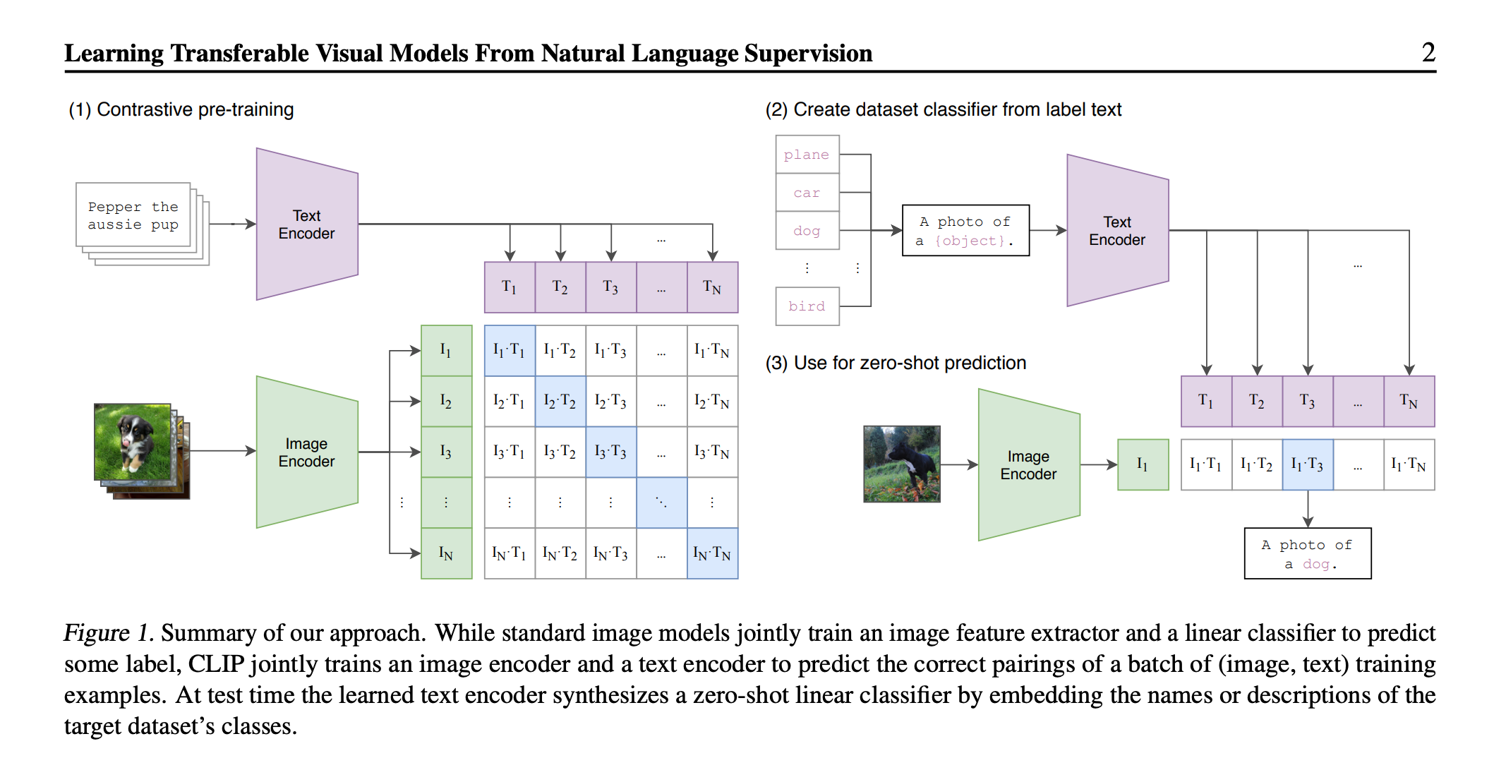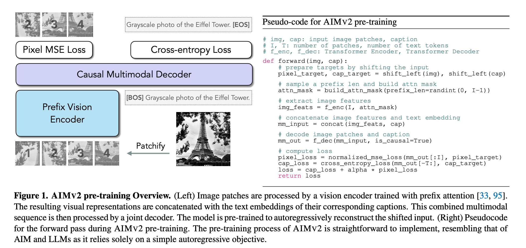 Source: Figure 1 from the CLIP paper The fundamental difference is that CLIP focuses on aligning existing image and text pairs, while AIMV2 tries to actively predict and reconstruct both the images and text. CLIP needs large batches to have enough positive and negative examples for its matching game, while AIMV2 can learn from each image-text pair independently since it extracts more information from each sample through its prediction task. AIMv2’s architectural choice specifically aims to strengthen the vision encoder. The model must build robust visual representations to support image reconstruction and subsequent text prediction.