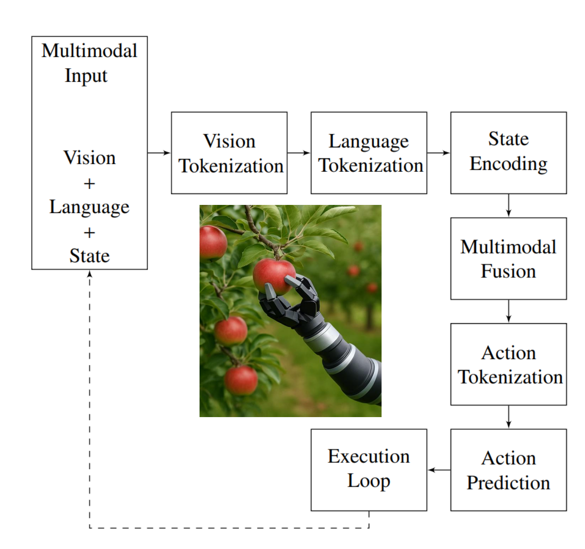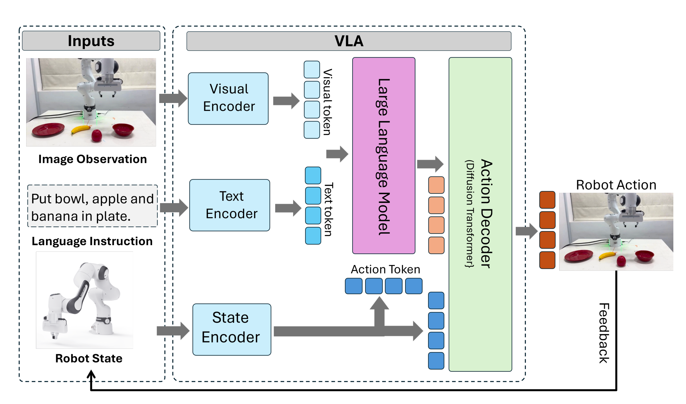 Action: Generating executable robot commands—joint angles, end-effector velocities, gripper states—through action decoders that translate semantic understanding into physical motor control.