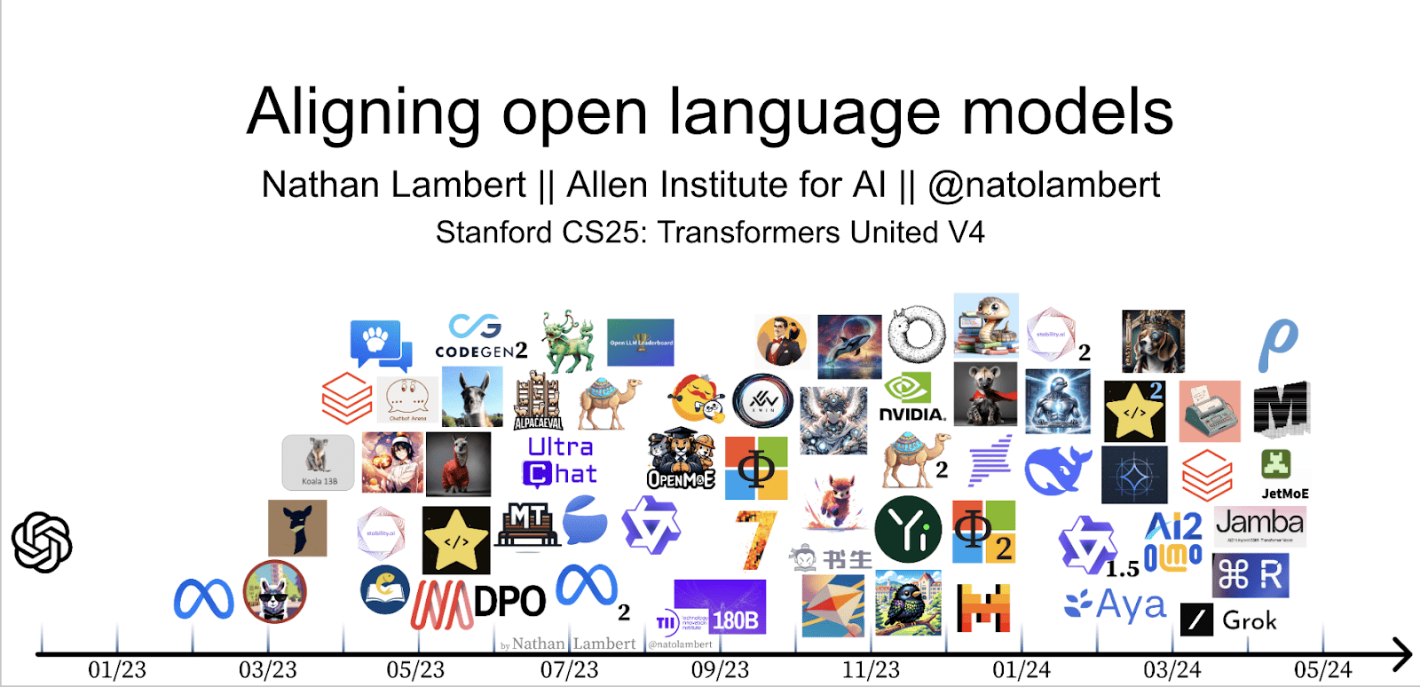 In the slides, he showcases the rapid progress in aligning open language models, driven by innovative techniques, community efforts, and the availability of open-source resources. He then briefly traces the evolution of LMs from Claude Shannonβs early work in 1948 to the emergence of transformers in 2017 and the subsequent release of influential models like GPT-1, BERT, and GPT-3. He observes GPT-3 -3βs rise in 2020, with its surprising capabilities and potential harms, highlighted the need for aligning LMs with human values and intentions. Nathan also provides a brief history of the following: