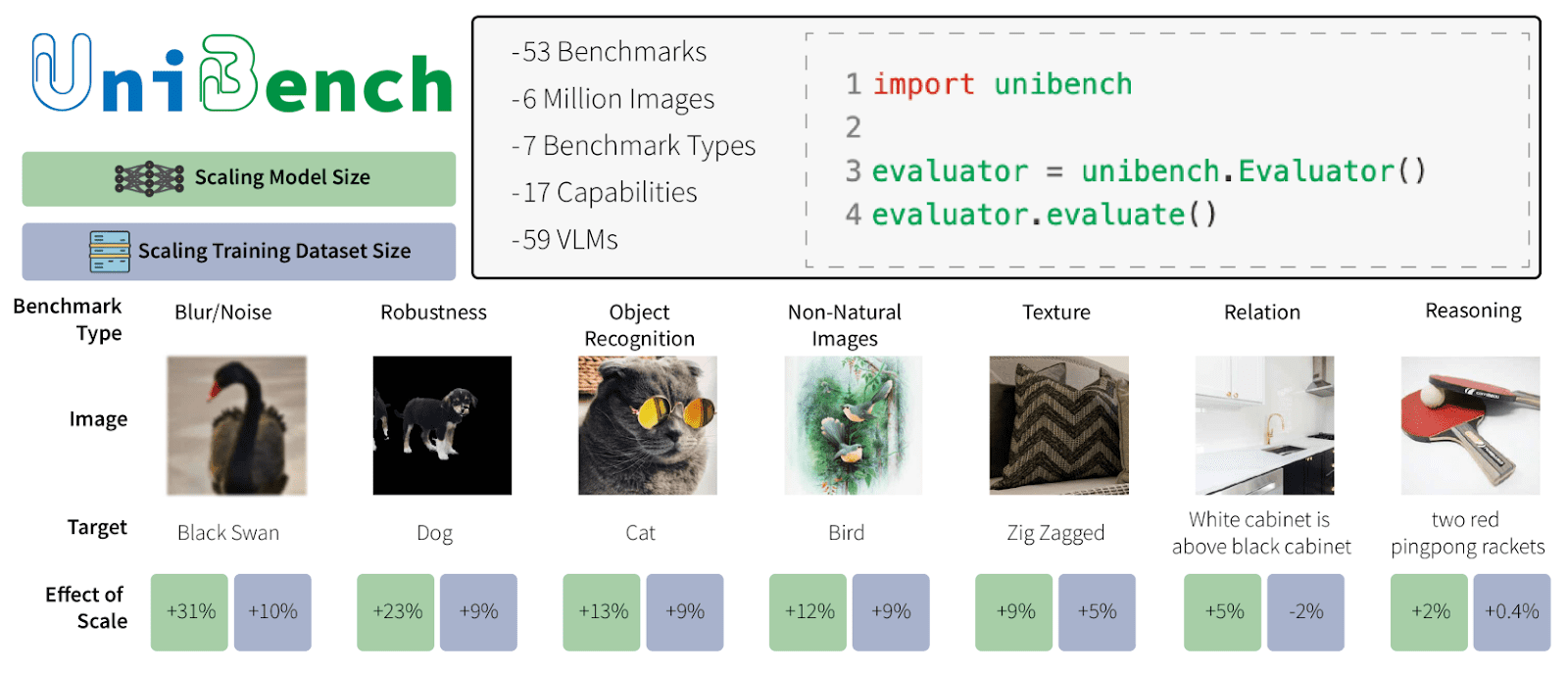 UniBench implements 53 benchmarks covering various capabilities, from object recognition to spatial awareness and reasoning.